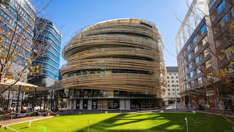 The spiral-like building wrapped in timber ribbons is designed by Japanese Architects Kengo Kuma & Associates. Well known for his signature timber cladding, Kengo Kuma designed the stadium for the 2020 Tokyo Olympic Games and brings his vision to Australia for the first time.